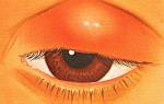 - Покраснение и заметные расширенные сосуды в конъюнктиве век и склерах.